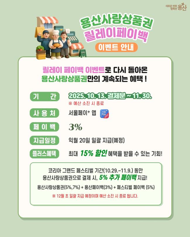 특히 10월 29일부터 11월 9일까지 열리는 `코리아 그랜드 페스티벌` 기간에 용산사랑상품권으로 결제하면, 추가 5% 페이백 혜택이 제공될 예정이다. 이 기간에는 기존 3% 페이백 혜택을 포함해 최대 15%의 할인 혜택을 받을 수 있다. 다만 해당 페이백은 예산 한도 내에서 선착순으로 지급되며, 예산이 조기 소진될 경우 행사는 종료된다.