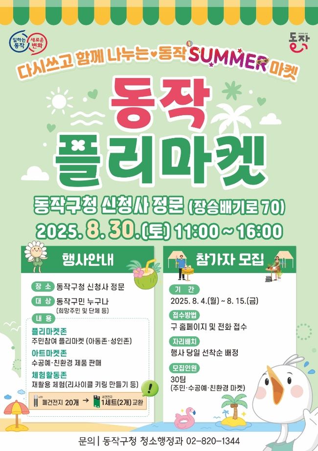동작구가 30일 구청 신청사 정문 일대에서 ‘동작 플리마켓’을 열고, 주민들이 직접 참여해 중고물품 거래와 친환경 체험을 즐길 수 있는 장을 마련한다.