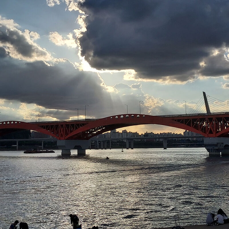 먹구름 사이로 햇빛이 비치며 물결이 반짝이고, 강변 계단과 산책로에는 더운 일상을 잠시