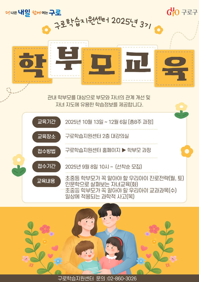 구로구(구청장 장인홍)는 오는 10월 13일부터 12월 6일까지 8주간 구로학습지원센터 2층 대강의실에서 ‘2025년 3기 학부모 프로그램’을 운영한다고 밝혔다. 이번 과정은 총 250명을 대상으로 하며, 학부모의 교육 역량을 높이고 자녀와의 관계를 개선하는 데 목적을 두고 있다.