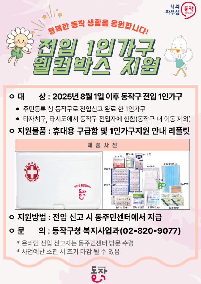 동작구, ‘전입 1인 가구 웰컴박스’ 한 달 만에 700여 가구 참여 - 방문·온라인 전입신고 1인 가구 대상 지원사업 순항 - 휴대용 구급함과 안내 리플릿 제공으로 안정적 정착 도와 - 내년에도 사업 지속, 물품 다양화 및 온라인 신청 도입 검토