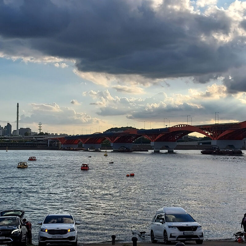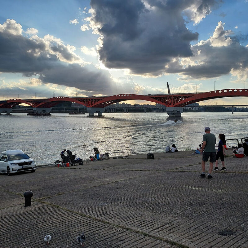 먹구름 사이로 햇빛이 비치며 물결이 반짝이고, 강변 계단과 산책로에는 더운 일상을 잠시