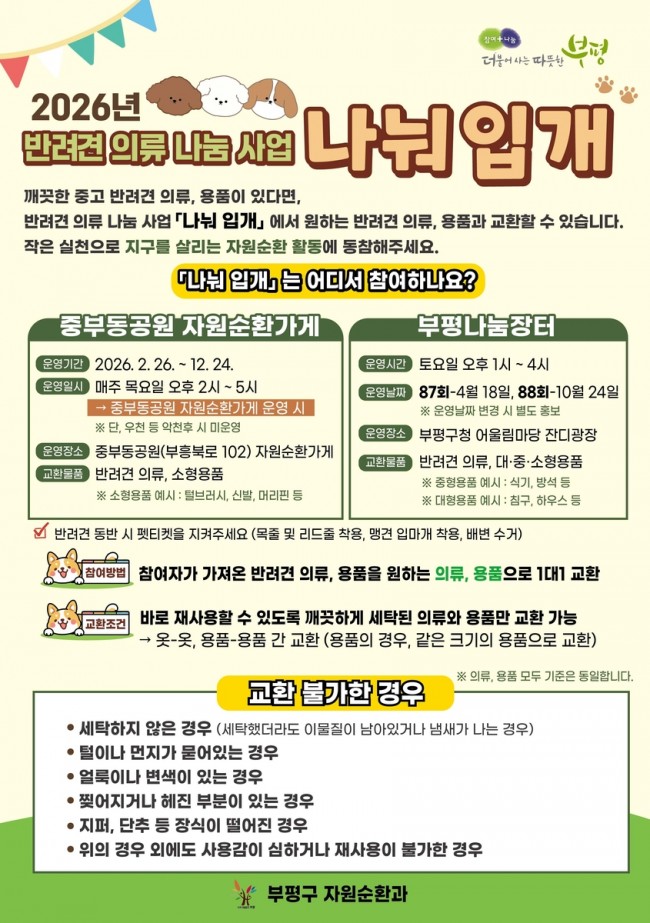 `나눠 입개`는 2026년 부평구가 새롭게 추진하는 자원순환 사업으로, 사용하지 않는 반려견 의류와 용품을 주민 간에 교환함으로써 폐기물 발생을 줄이고 자원순환 실천 문화를 확산하고자 마련됐다.